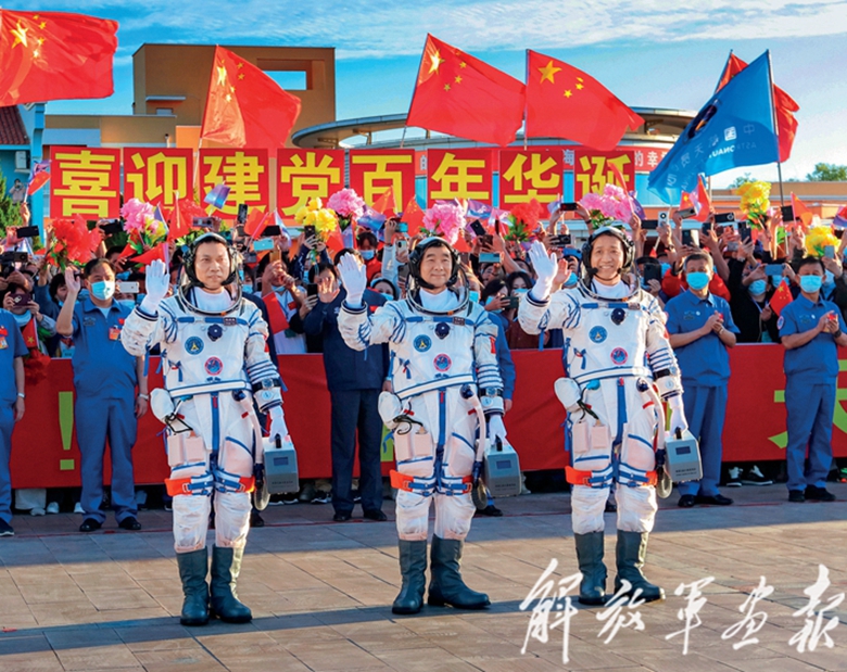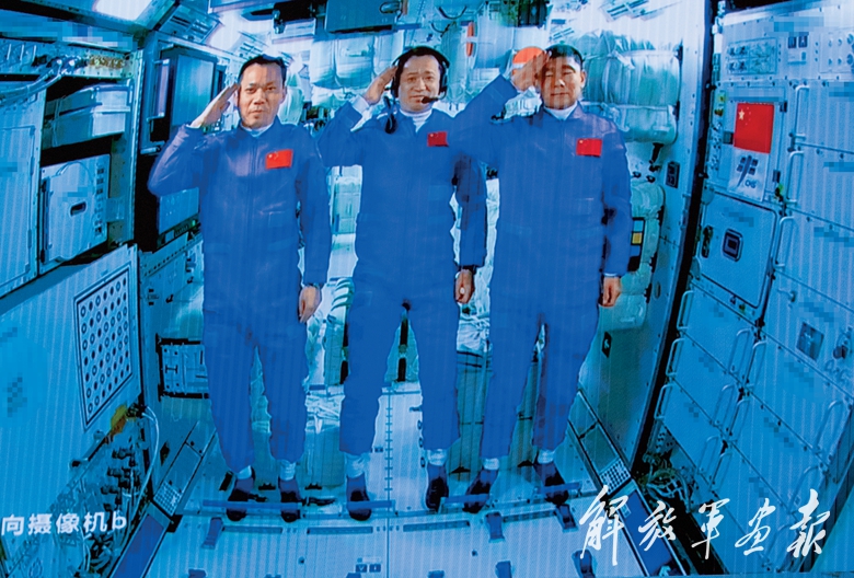 “總指揮長(zhǎng)同志,我們奉命執(zhí)行神舟十二號(hào)載人飛行任務(wù),準(zhǔn)備完畢,請(qǐng)指示。中國(guó)人民解放軍航天員大隊(duì)航天員聶海勝。”“航天員劉伯明。”“航天員湯洪波。”