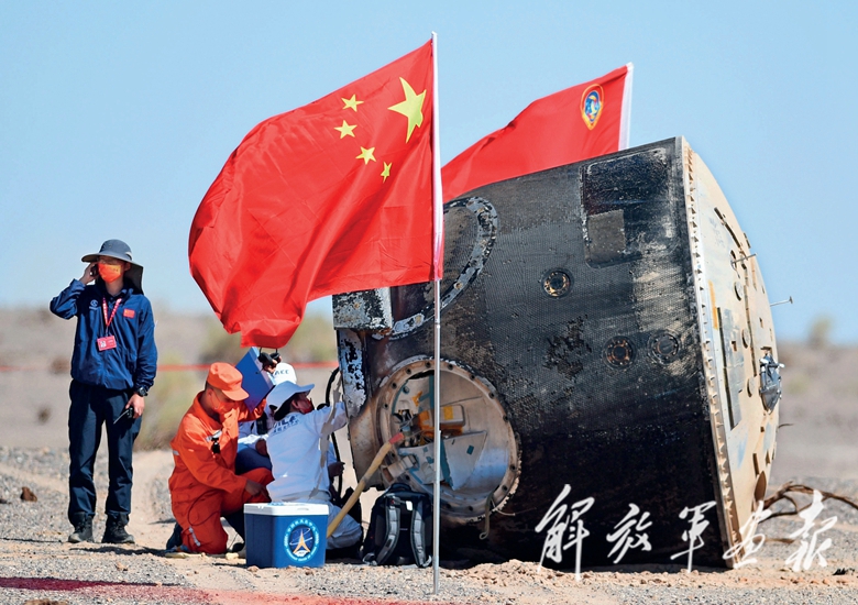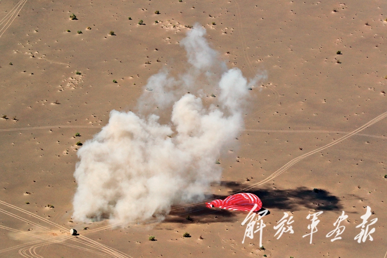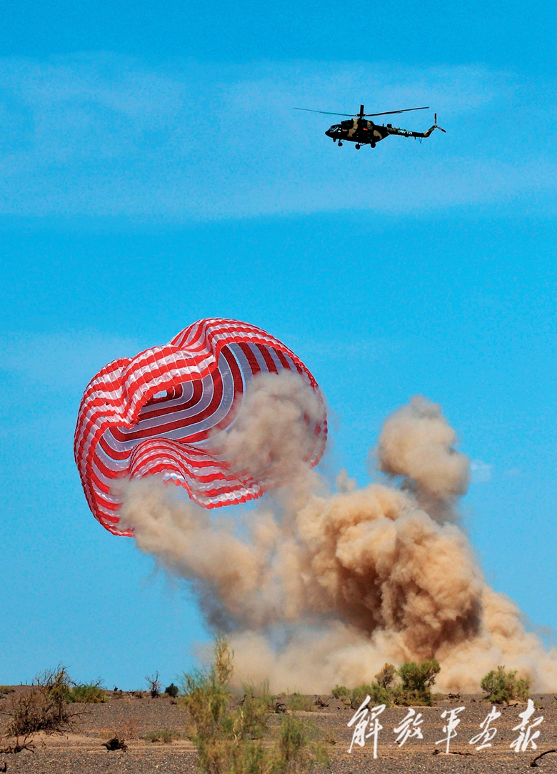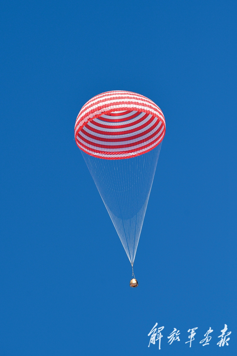 空中,紅白相間的降落傘打開(kāi),返回艙緩緩降落,精準(zhǔn)著陸。
