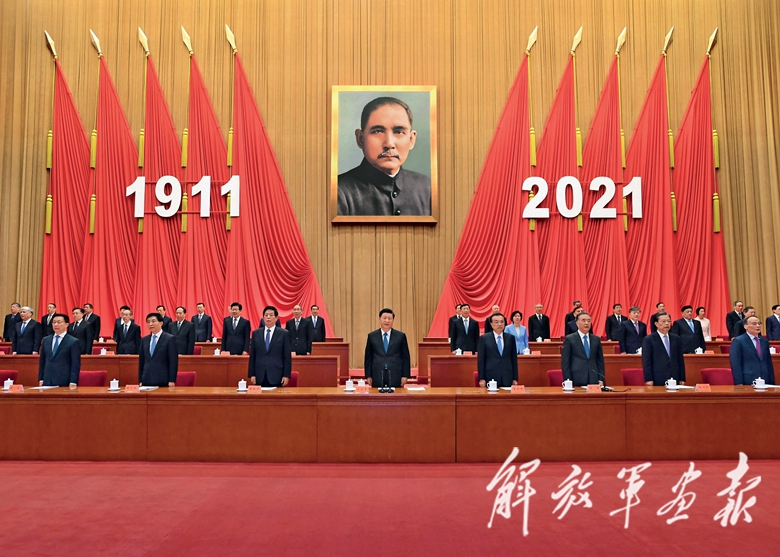 人民大會堂大禮堂氣氛莊重熱烈。主席臺上方懸掛著“紀念辛亥革命110周年大會”會標,后幕正中是孫中山先生畫像,10面紅旗分列兩側(cè),上面懸掛的“1911”“2021”字標格外醒目。