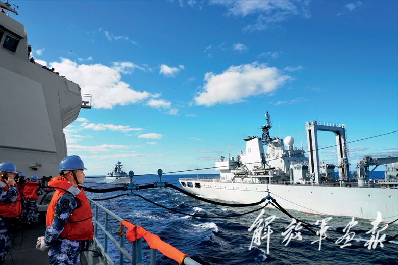 參演艦艇進(jìn)行海上補(bǔ)給。