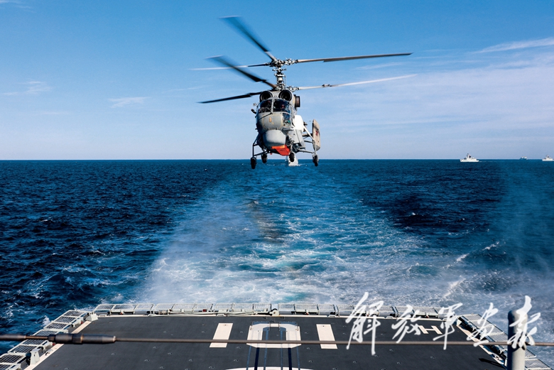 俄方艦載直升機(jī)飛臨中方艦艇進(jìn)行模擬著艦演練。