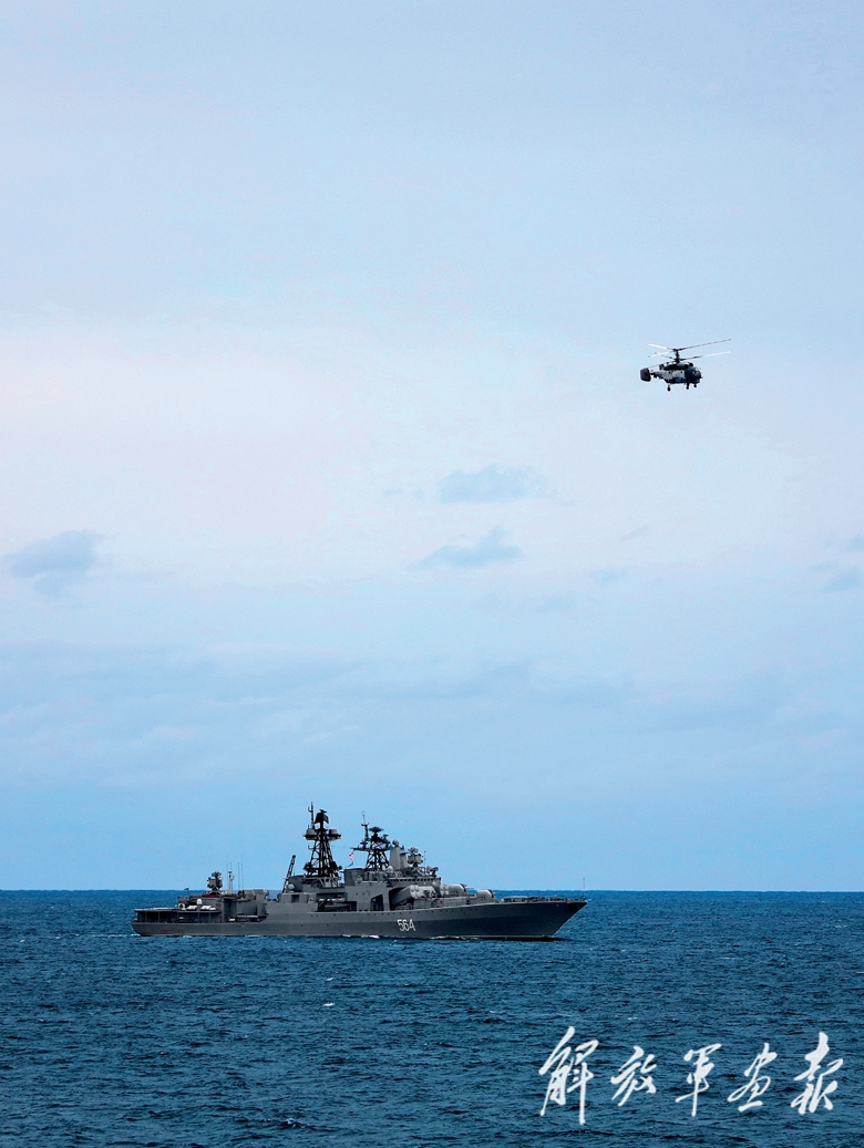 “立即開展協(xié)同反潛!”中方指揮所根據(jù)當(dāng)前態(tài)勢和綜合情報(bào)向艦艇戰(zhàn)術(shù)群下達(dá)反潛防御作戰(zhàn)命令。隨即,各艦載直升機(jī)依次升空前出;參演艦艇布放拖曳聲吶;從我國某機(jī)場起飛的中方反潛巡邏機(jī),首次經(jīng)俄領(lǐng)空飛臨演習(xí)目標(biāo)海域進(jìn)行反潛搜索……一連串組合拳打出去,形成的立體搜獵網(wǎng)逼向水下目標(biāo)。