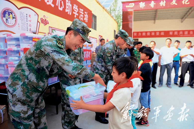 2018年,陸軍第83集團軍某旅扶貧工作小組深入定點扶貧地區(qū)開展助學(xué)工作。(攝影/安成虎)