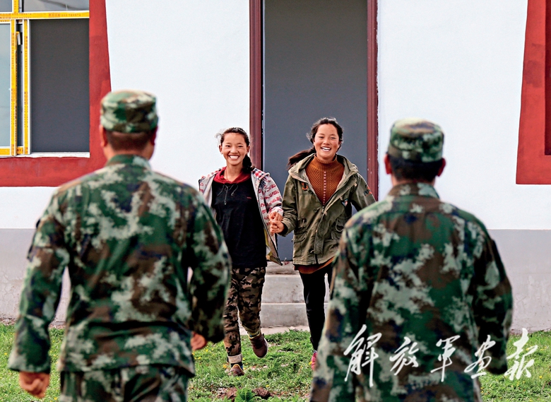看到幫助自家修建新房的武警定西支隊官兵來訪,兩個藏族小女孩歡呼雀躍。(攝影/穆可雙)