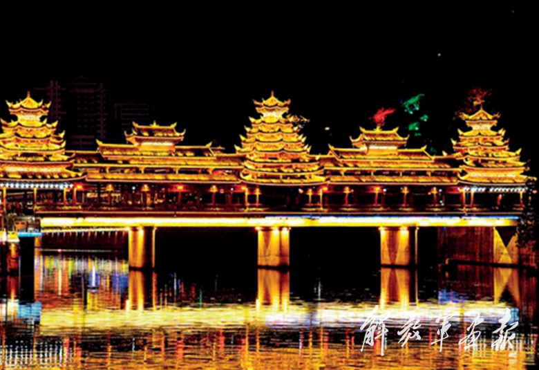 湖南省通道縣縣城雙江河萬福橋夜景。(攝影/柳 軍)