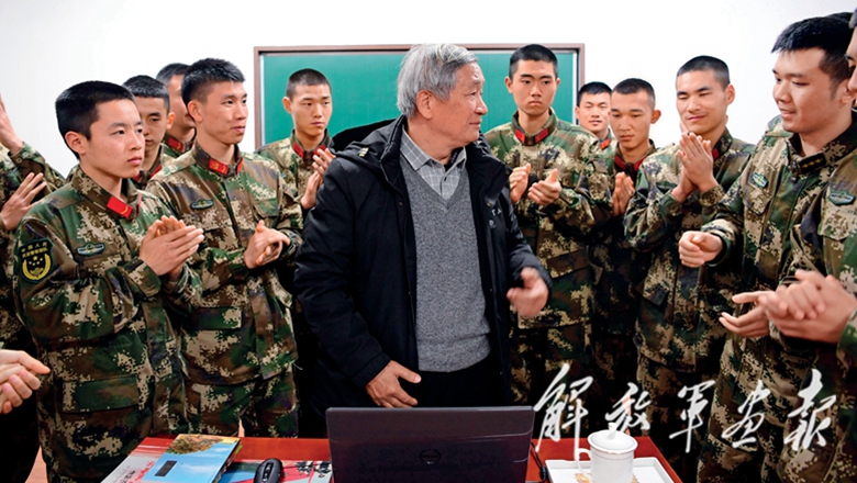 2021年2月2日,三灣改編的親歷者和見證人、老紅軍李立之子何繼明來到武警江西總隊吉安支隊永新中隊,與官兵座談交流。(攝影/曹先訓(xùn))