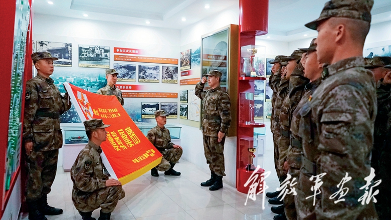 陸軍第82集團軍某旅裝步三連在榮譽室內(nèi)組織官兵向連旗宣誓,紀(jì)念紅軍長征勝利85周年。(攝影/高飛翔)