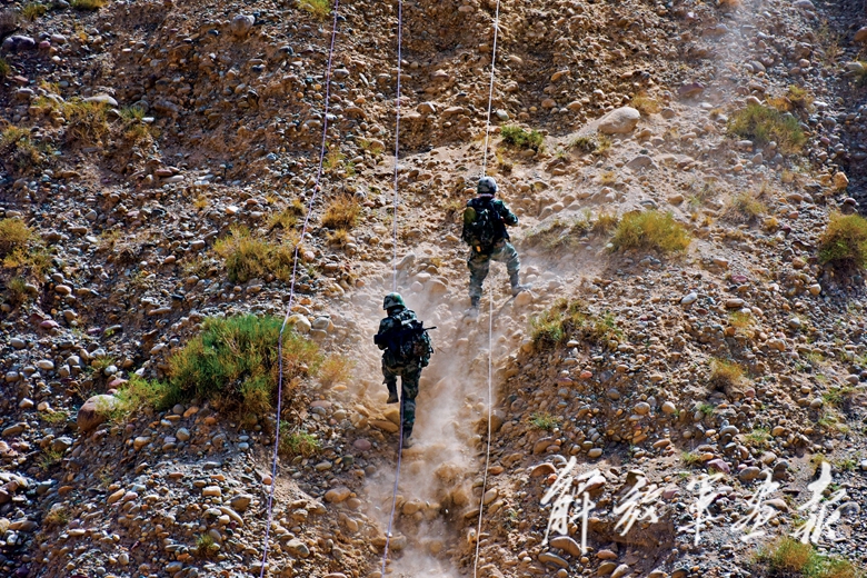 偵察兵在西北荒漠腹地進行攀巖訓練。