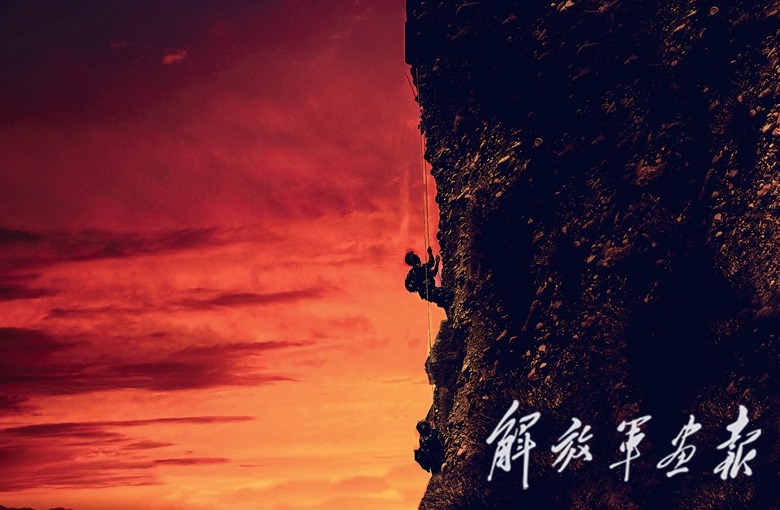 夕陽下,偵察兵進行攀巖比賽。