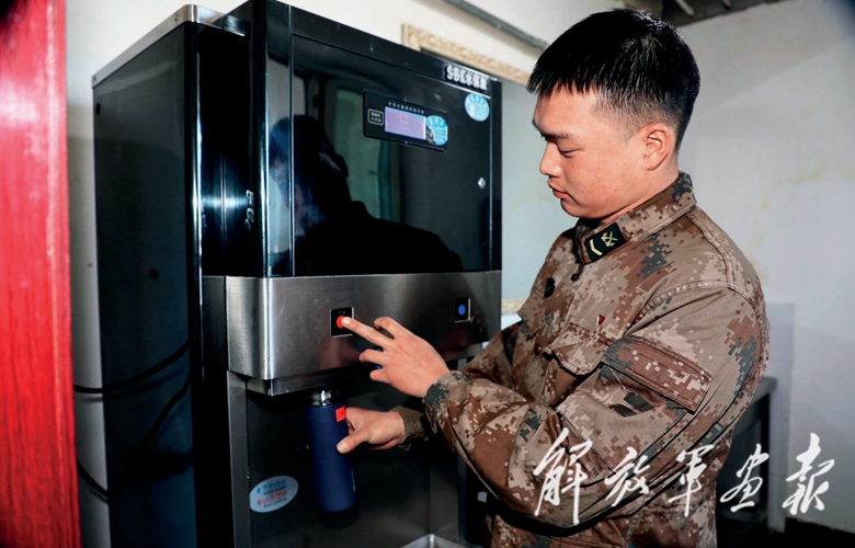 連隊營區(qū)位于古爾班通古特沙漠邊緣,水的含堿性很高。2005年9月,上級修建了界河供水管道,連隊從此告別了從苦水井取水的生活,但距離連隊8公里的前哨班官兵的用水難題依然沒有得到徹底解決。2017年12月,一口新水井在前哨班正式投入使用。如今,哨所接通了長明電,建成了洗澡間,安裝了電熱水器,官兵足不出戶就能洗上熱水澡。