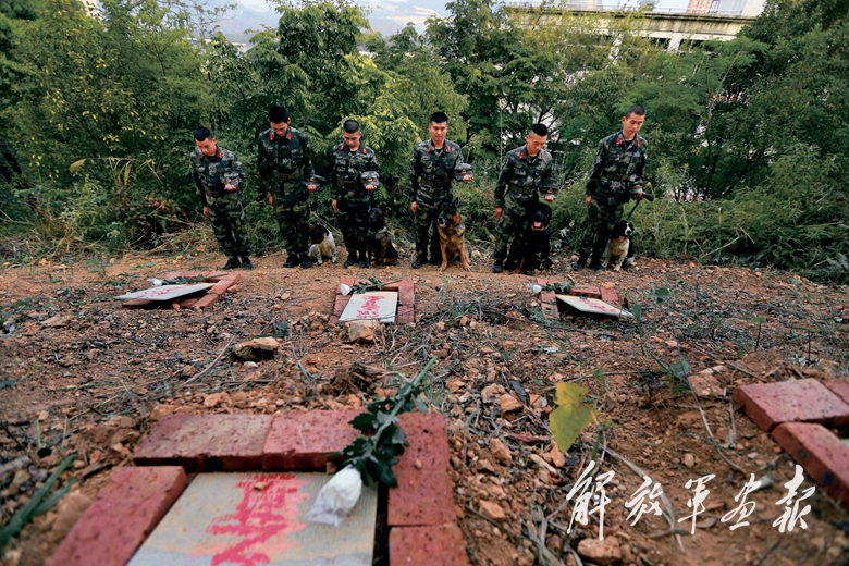 這一天,武警廣東總隊執(zhí)勤第三支隊十中隊軍犬班的訓導員帶著搜救犬來到后山的“忠犬墓”,祭奠安葬在這里的20只功勛犬。它們生前曾與官兵并肩作戰(zhàn),在粵港一線執(zhí)行巡邏管控、維穩(wěn)處突任務,立下赫赫戰(zhàn)功。