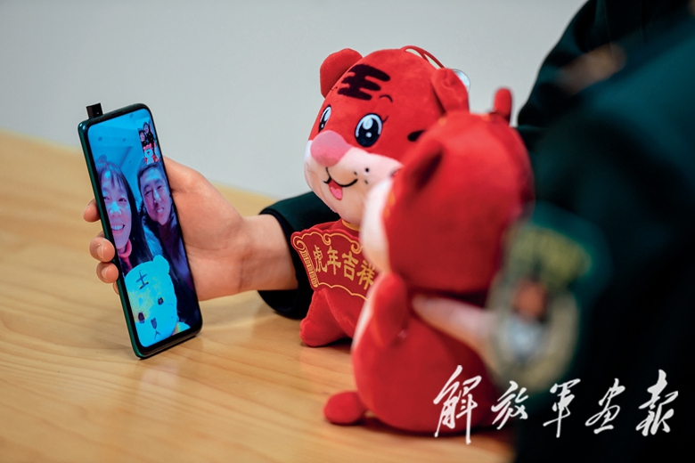 陸軍第81集團(tuán)軍某旅官兵利用手機(jī)視頻向千里之外的父母拜年。(攝影/王 鵬)