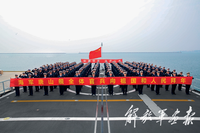海軍唐山艦官兵赴某海域執(zhí)行任務(wù),靠港之際向祖國(guó)和人民拜年。(攝影/特約記者 馬玉彬)