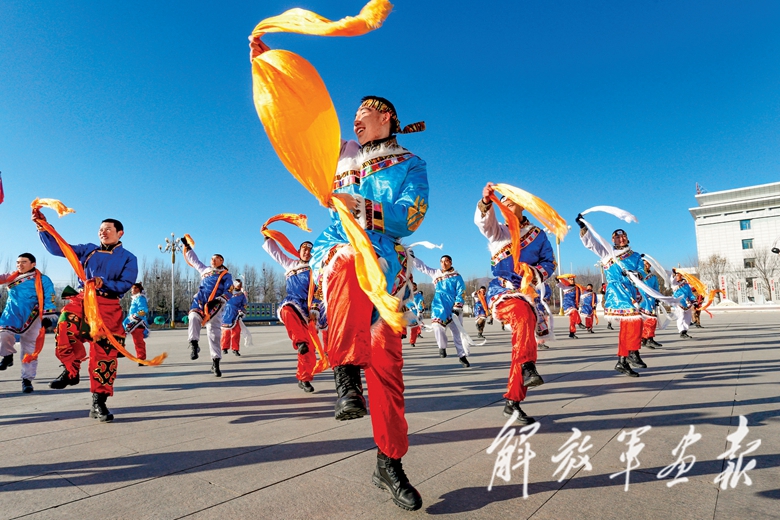 武警青??傟?duì)某支隊(duì)官兵開(kāi)展新春大拜年活動(dòng),官兵跳起歡快的藏族舞蹈。(攝影/羅元?jiǎng)P)
