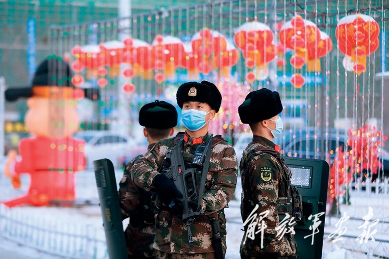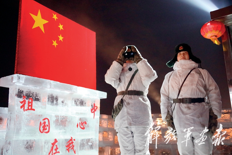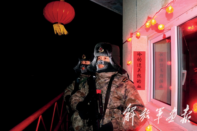除夕夜,北部戰(zhàn)區(qū)陸軍某邊防旅“黑河好八連”官兵在零下30多攝氏度的界江上站崗執(zhí)勤,守衛(wèi)萬(wàn)家燈火。(攝影/劉梟梟)