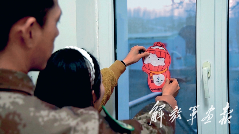 歐陽(yáng)冬梅在營(yíng)區(qū)窗戶貼上自己親手制作的“雪容融”剪紙。