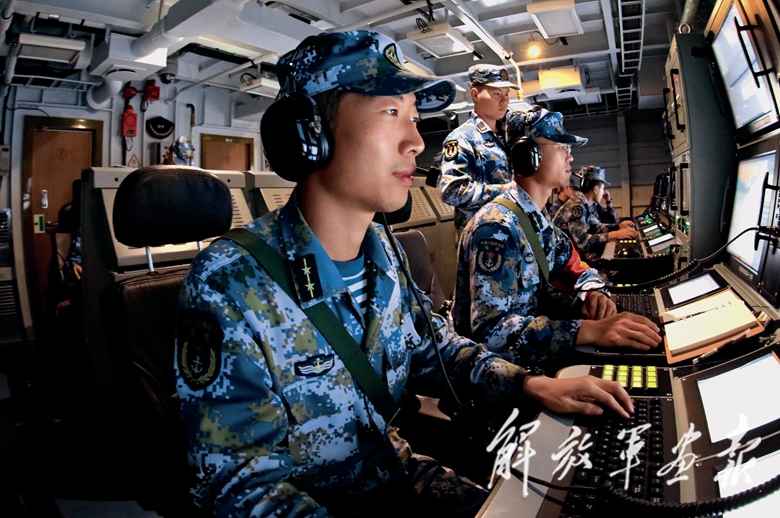 作戰(zhàn)指揮室內(nèi),熒屏閃爍,氣氛緊張,各戰(zhàn)位密切協(xié)同,口令聲接連不斷。雷達(dá)部位不斷跟蹤模擬“敵”武裝漁船靶標(biāo),并持續(xù)報告目標(biāo)要素;航海部位準(zhǔn)確匯算航向、航速,占領(lǐng)有利攻擊陣位……