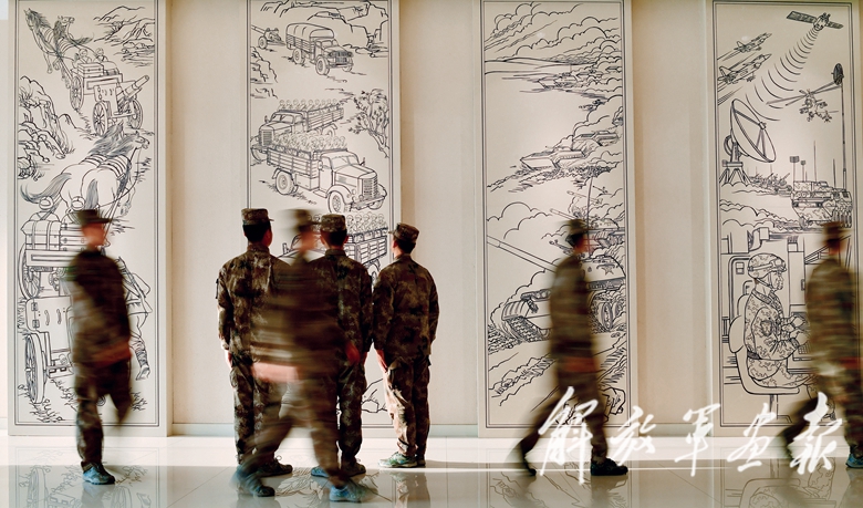 官兵在描繪旅隊發(fā)展建設歷程的展板前駐足觀看。