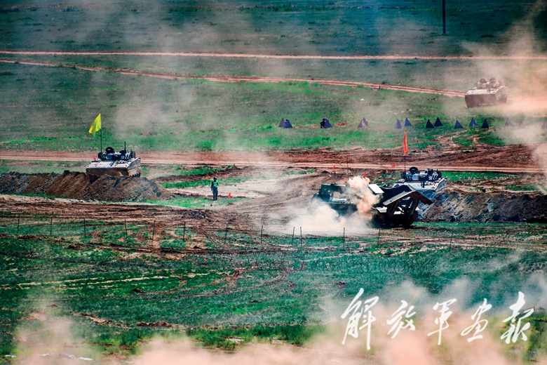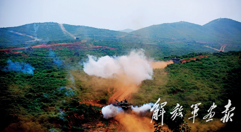 實彈演練中,官兵發(fā)射火箭彈,對“敵”陣地實施火力打擊。