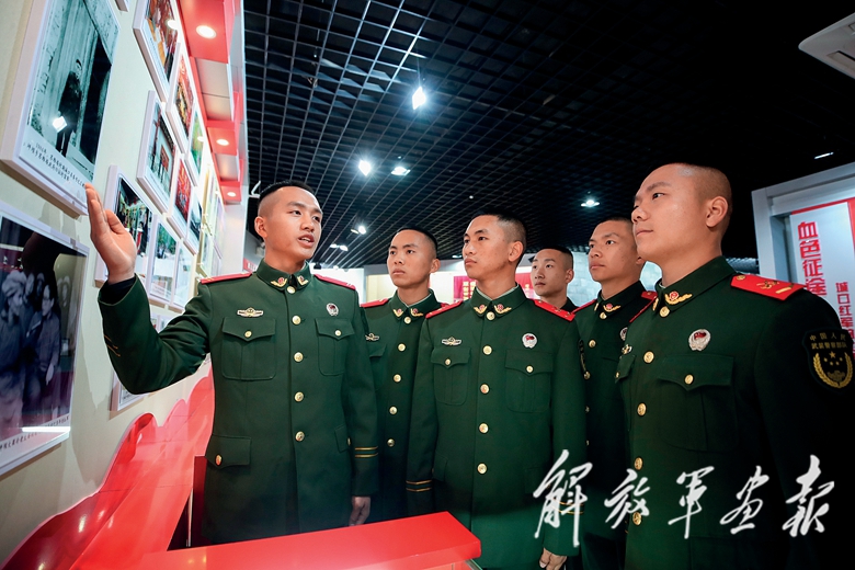 在“戰(zhàn)斗模范連”榮譽旗前,指導員陳思宇為官兵講述連隊光榮歷史。