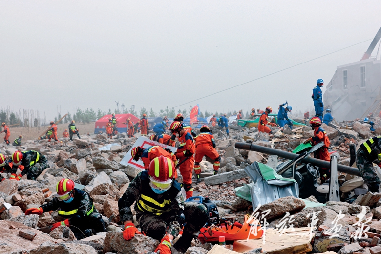 參演官兵在廢墟中搜尋生命跡象。