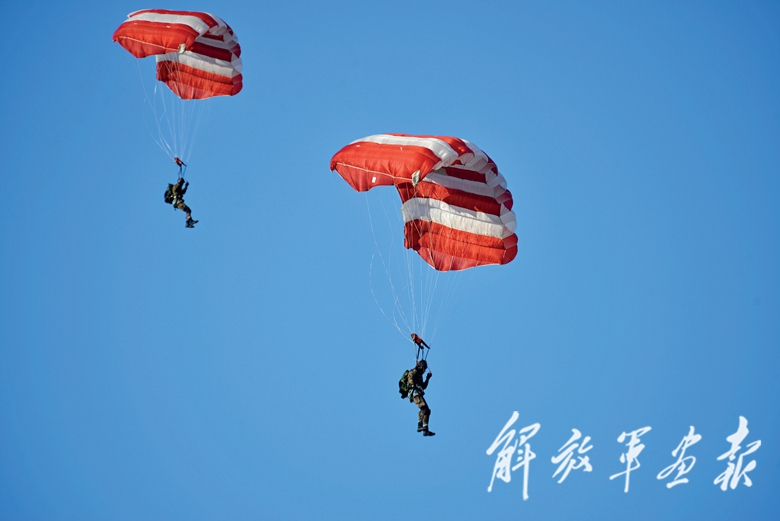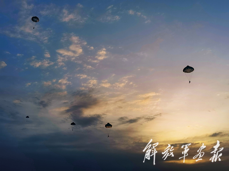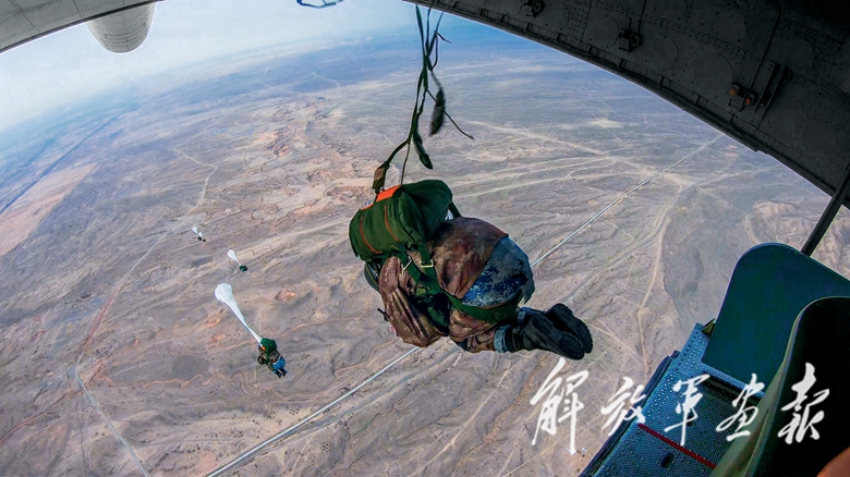 夜色漆黑如墨。抵達(dá)傘降地域上空,飛機尾門緩緩打開。特戰(zhàn)隊員魚貫躍出機艙,瞬間融入夜色中。蒼茫夜空中,點點微光和閃爍星光交相輝映,更多了幾分神秘。