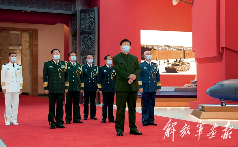 下午4時30分許, 習近平來到中國人民革命軍事博物館,步入展廳參觀展覽。展覽聚焦以習近平同志為核心的黨中央領(lǐng)導國防和軍隊建設的偉大實踐,安排8個單元展區(qū),設置“黨在新時代的強軍目標”、“重整行裝再出發(fā)”、“礪劍鑄盾 奔向一流”、“大好河山 寸土不讓”、“愛我人民愛我軍”、“深情勵三軍 奮進新征程”等重點展項,通過1400余件文物實物、630余張照片、近百套武器裝備模型以及大量圖表、視頻、藝術(shù)作品、互動項目等,生動展示了新時代國防和軍隊建設的壯闊歷程和偉大成就,充分展現(xiàn)了人民軍隊忠誠維護核心、矢志奮斗強軍的昂揚風貌。習近平不時駐足觀看,認真聽取講解,詢問有關(guān)情況。