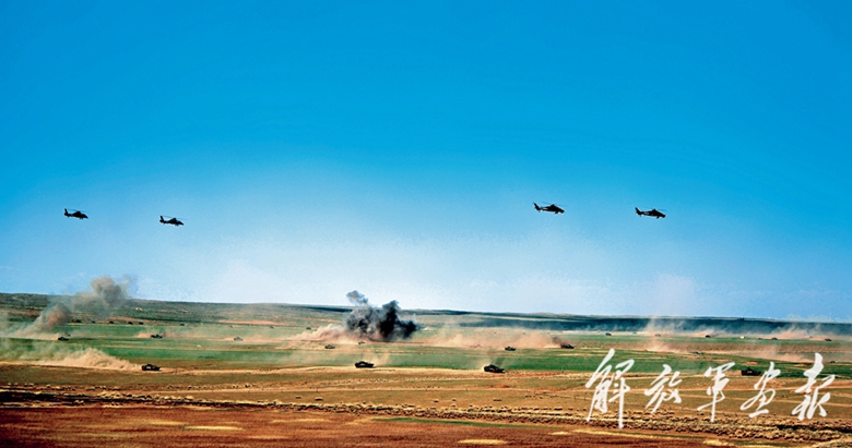 2014年,陸軍某旅組織實戰(zhàn)化演習,裝甲突擊群在空中直升機掩護下奪占前沿陣地。(攝影/何 生)