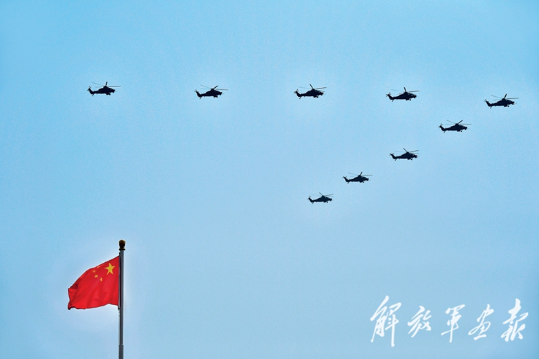 2019年10月1日,在慶祝中華人民共和國成立70周年閱兵式上,陸航突擊梯隊飛過天安門廣場接受檢閱。(攝影/新華社記者 周 華)