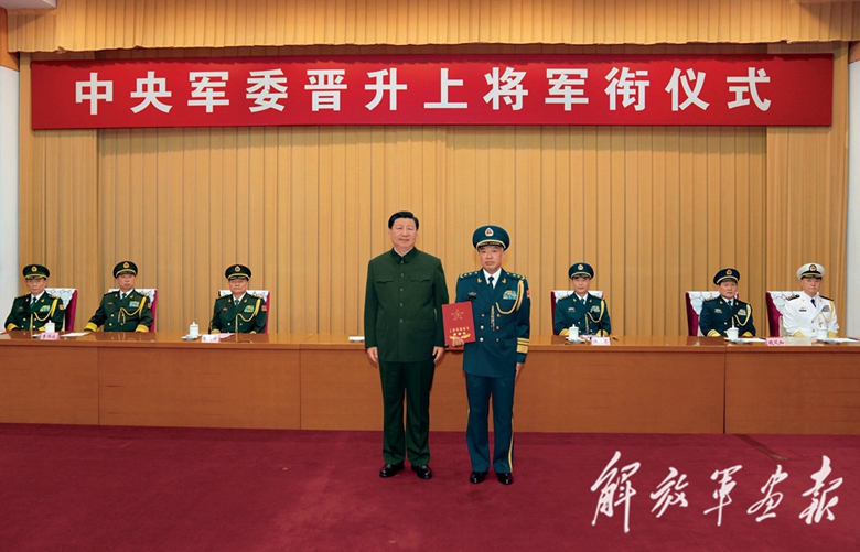 上午11時許,晉銜儀式在莊嚴的國歌聲中開始。中央軍委副主席許其亮宣讀了中央軍委主席習近平簽署的晉升上將軍銜命令。中央軍委副主席張又俠主持晉銜儀式。