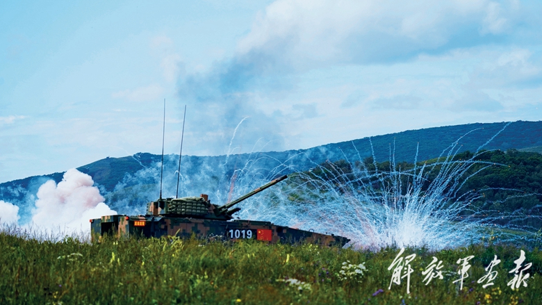 當(dāng)?shù)貢r(shí)間9月6日16時(shí)50分許,實(shí)兵演練正式開始。起伏泥濘的山路上,由99型坦克、04A型步戰(zhàn)車為主組成的中方前沿防守隊(duì)率先對(duì)“敵”重要目標(biāo)發(fā)起攻擊。隨后,中方防空隊(duì)的雙35高炮、便攜式防空導(dǎo)彈對(duì)“敵”空中來襲目標(biāo)進(jìn)行毀傷攔截。部署在后方的中方火力打擊隊(duì)使用自行榴彈炮壓制“敵”裝甲集群。坦克、步戰(zhàn)車縱橫馳騁,導(dǎo)彈、火炮發(fā)出陣陣怒吼,一波又一波來自中方參演部隊(duì)發(fā)出的炮彈,直撲“敵”各個(gè)目標(biāo),大地騰起陣陣煙霧。