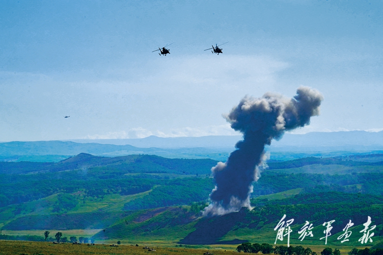 中方參演部隊(duì)與多國參演部隊(duì)陸上力量密切配合,在縱深開進(jìn)中運(yùn)用密集火力有效殺傷前沿和縱深之“敵”,擊潰“敵”濱海聯(lián)合作戰(zhàn)部隊(duì)主力集群。