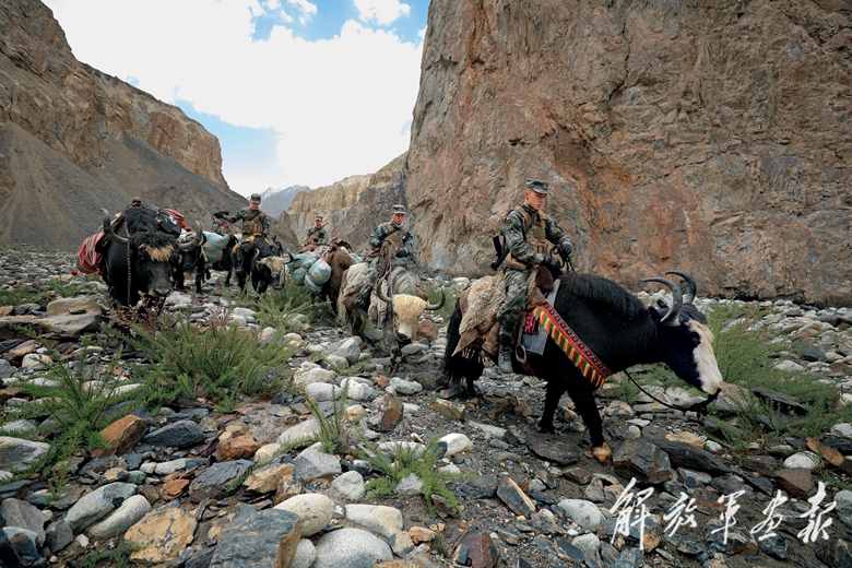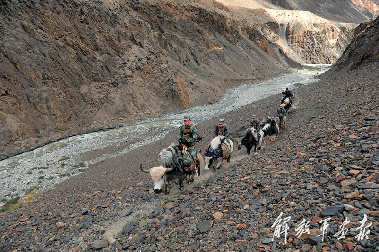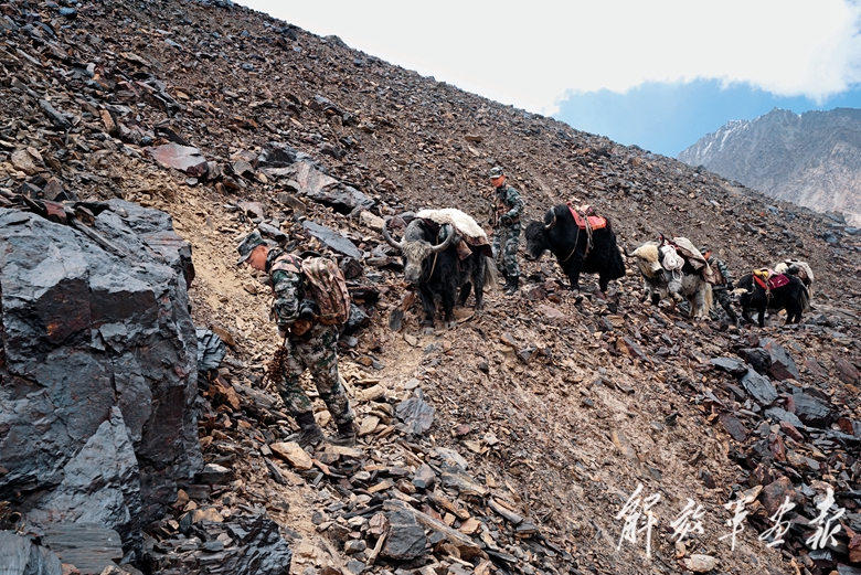 隨著海拔不斷升高,氧氣越發(fā)稀薄,紫外線也變得越來越強烈。牦牛馱著官兵行進在陡峭的斜坡上,沉重的腳步踏過,碎石不斷滾落懸崖,發(fā)出的“嘩嘩”聲令人心悸?!跋蛏吓赖乃俣纫欢ㄒ仁^往下滑的速度快……”帶隊領(lǐng)導經(jīng)驗豐富,不斷提醒官兵注意安全。