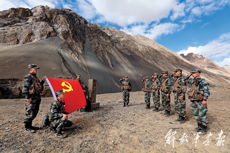 第二天一早,巡邏隊伍向終點發(fā)起沖鋒。這是一段100多米高、坡度約為五六十度的陡坡。拴好牦牛,官兵開始奮力向上攀爬,一步、兩步、三步……終于抵達坡頂,官兵個個大汗淋漓。界碑就在眼前,在陽光的照耀下,碑上兩個紅色的大字“中國”顯得更加鮮艷醒目。凝望著界碑,康澤乾的眼眶濕潤了。