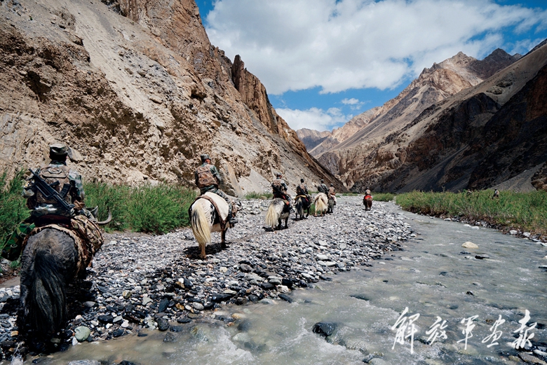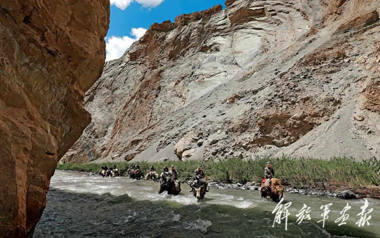 官兵騎牦牛通過湍急冰冷的河流。