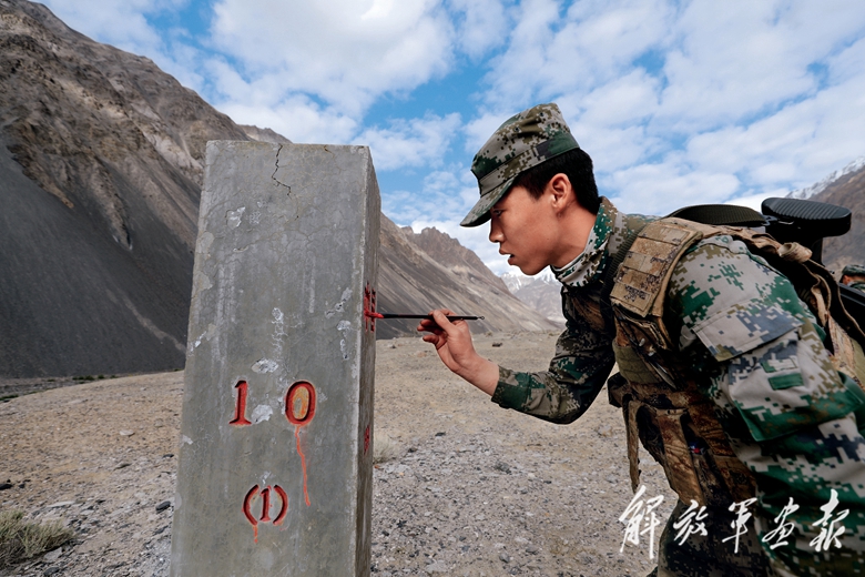 戰(zhàn)士康澤乾為界碑描紅。