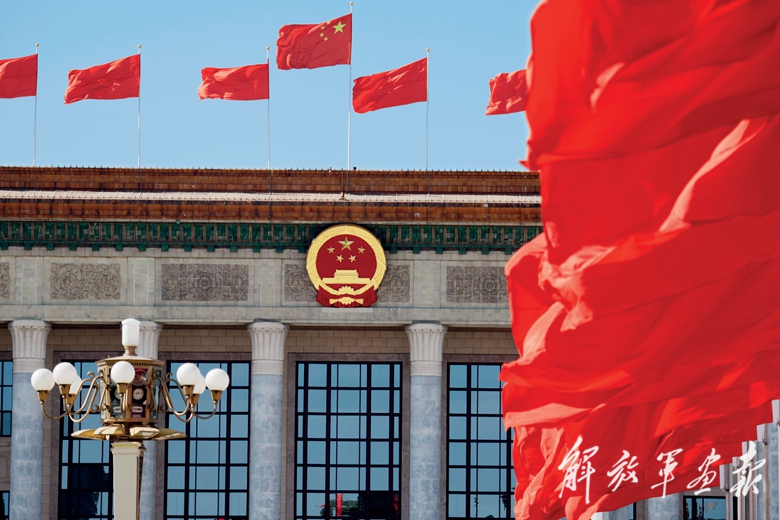 人民大會堂前紅旗飄揚(yáng),喜迎盛會。(攝影/記者 穆瑞林)