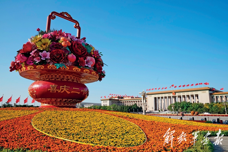 天安門廣場花團(tuán)錦簇,一派祥和景象。 (攝影/新華社記者 王毓國)