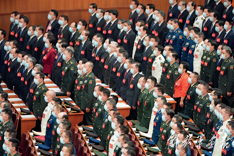 會議開始后,代表們高唱中華人民共和國國歌。(攝影/新華社記者 才 揚(yáng))