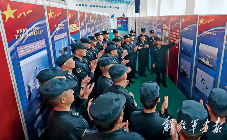 海軍某護(hù)衛(wèi)艦支隊(duì)組織官兵參觀“向海圖強(qiáng)春潮涌”主題展覽,感受強(qiáng)軍這10年取得的非凡成就。(攝影/王光杰)