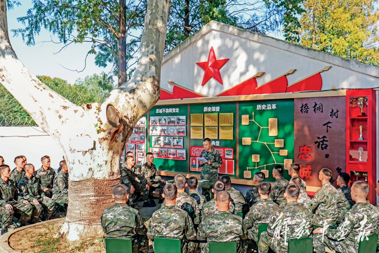 武警江蘇總隊(duì)新兵團(tuán)開展“梧桐樹下話忠誠(chéng)”活動(dòng),官兵結(jié)合親身經(jīng)歷,講述學(xué)習(xí)黨的二十大報(bào)告的感悟。(攝影/張樹彬)