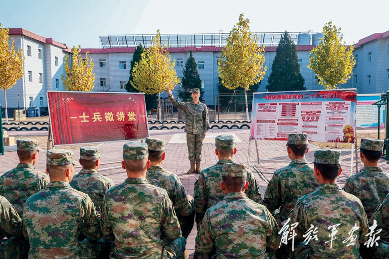 陸軍第82集團(tuán)軍某旅結(jié)合學(xué)習(xí)宣傳貫徹黨的二十大精神開設(shè)“士兵微講堂”,激發(fā)官兵自我學(xué)習(xí)、自我教育的熱情。(攝影/褚玉壘)