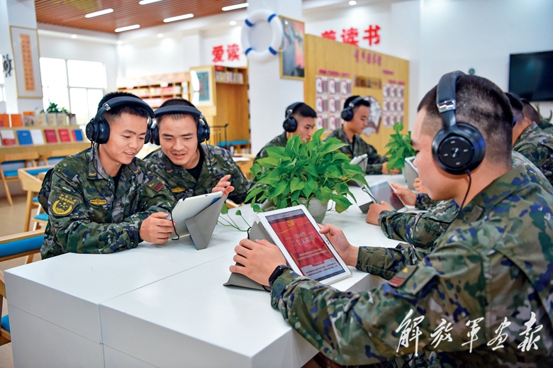 陸軍第74集團(tuán)軍某旅官兵在學(xué)習(xí)室利用強(qiáng)軍網(wǎng)學(xué)習(xí)黨的二十大精神。(攝影/胡 亮)