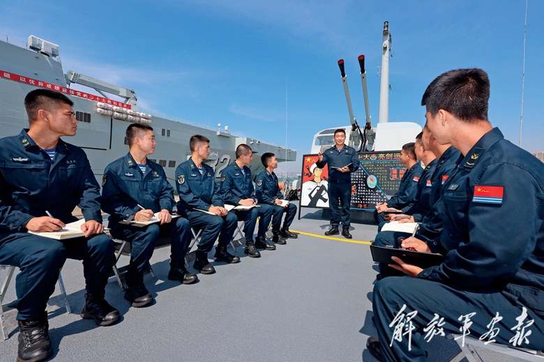 南部戰(zhàn)區(qū)海軍某登陸艦支隊(duì)組織官兵討論交流學(xué)習(xí)黨的二十大報(bào)告體會(huì)。(攝影/喬晨曦)