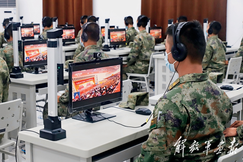 東部戰(zhàn)區(qū)陸軍某旅官兵在全媒體信息中心收看大會(huì)盛況。(攝影/劉镕宇)