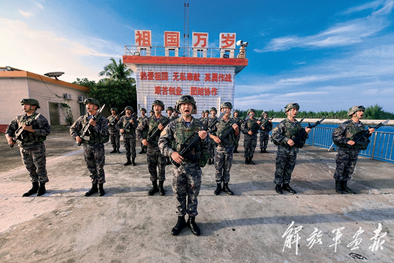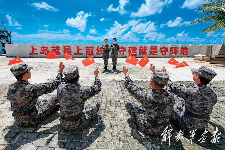 南沙永暑礁守備部隊(duì)組織文藝骨干以“快板書”形式講述強(qiáng)軍這10年來(lái)的偉大成就,官兵歡欣鼓舞、信心滿懷。(攝影/喬宇飛)
