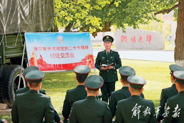 新疆軍區(qū)某合成團(tuán)官兵開展學(xué)習(xí)黨的二十大報(bào)告專題討論會(huì)。(攝影/袁 凱)