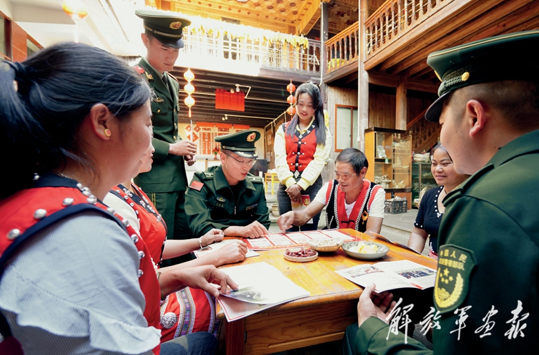 武警云南總隊(duì)保山支隊(duì)官兵走進(jìn)駐地佤族村,宣傳黨的二十大精神。(攝影/范開浪)