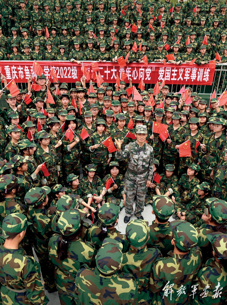 重慶市巴南區(qū)人武部組織軍訓(xùn)教官為正在參加軍訓(xùn)的魚洞中學(xué)學(xué)生講解黨的二十大相關(guān)知識(shí)點(diǎn)。(攝影/高效文)