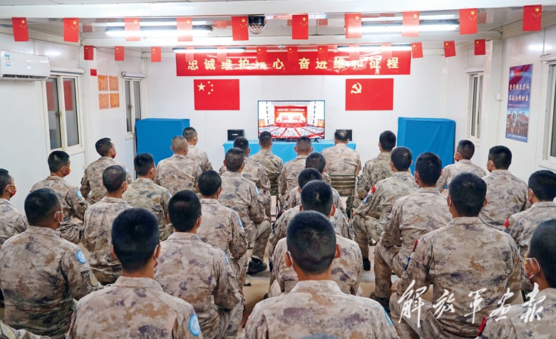 中國(guó)第十二批赴南蘇丹(瓦烏)維和工兵分隊(duì)官兵收看黨的二十大開幕會(huì)。(攝影/張益瑋)
